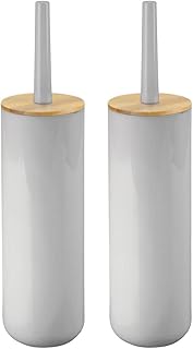 mDesign Compact Freestanding Plastic Toilet Bowl Brush and Holder for Bathroom Storage - Plastic and Bamboo - Sturdy, Deep Cleaning - 2 Pack - Gray/Natural Wood Finish