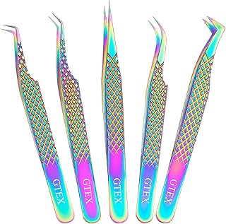 GTEX Wimpern Pinzette, 5 Premium Qualität Japanese Edelstahl Wimpernverlängerung Pinzette - Gerade Spitze, Volumen Und Gebogene Pinzette, 45 90 Grad Wimpernpinzetten, Lash Tweezers Regenbogen